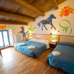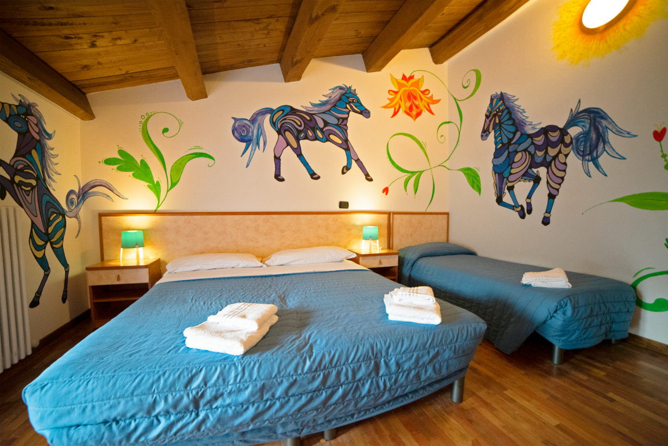 Camera tripla con un letto matrimoniale ed un letto singolo, bagno con box doccia. Pareti decorate a mano con cavalli fantastici e motivi floreali. Vengono fornite lenzuola, asciugamani, coperte, sapone liquido, fon e collegamento wi-fi gratuito.