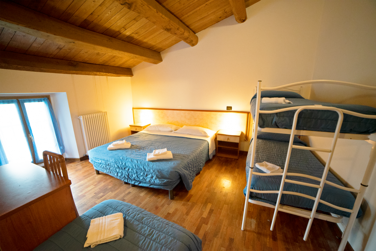 La camera Bidentina è una quintupla con bagno, doccia, letto matrimoniale un letto singolo e un letto a castello. Vengono fornite lenzuola, asciugamani, coperte, sapone liquido, fon e collegamento wi-fi gratuito..